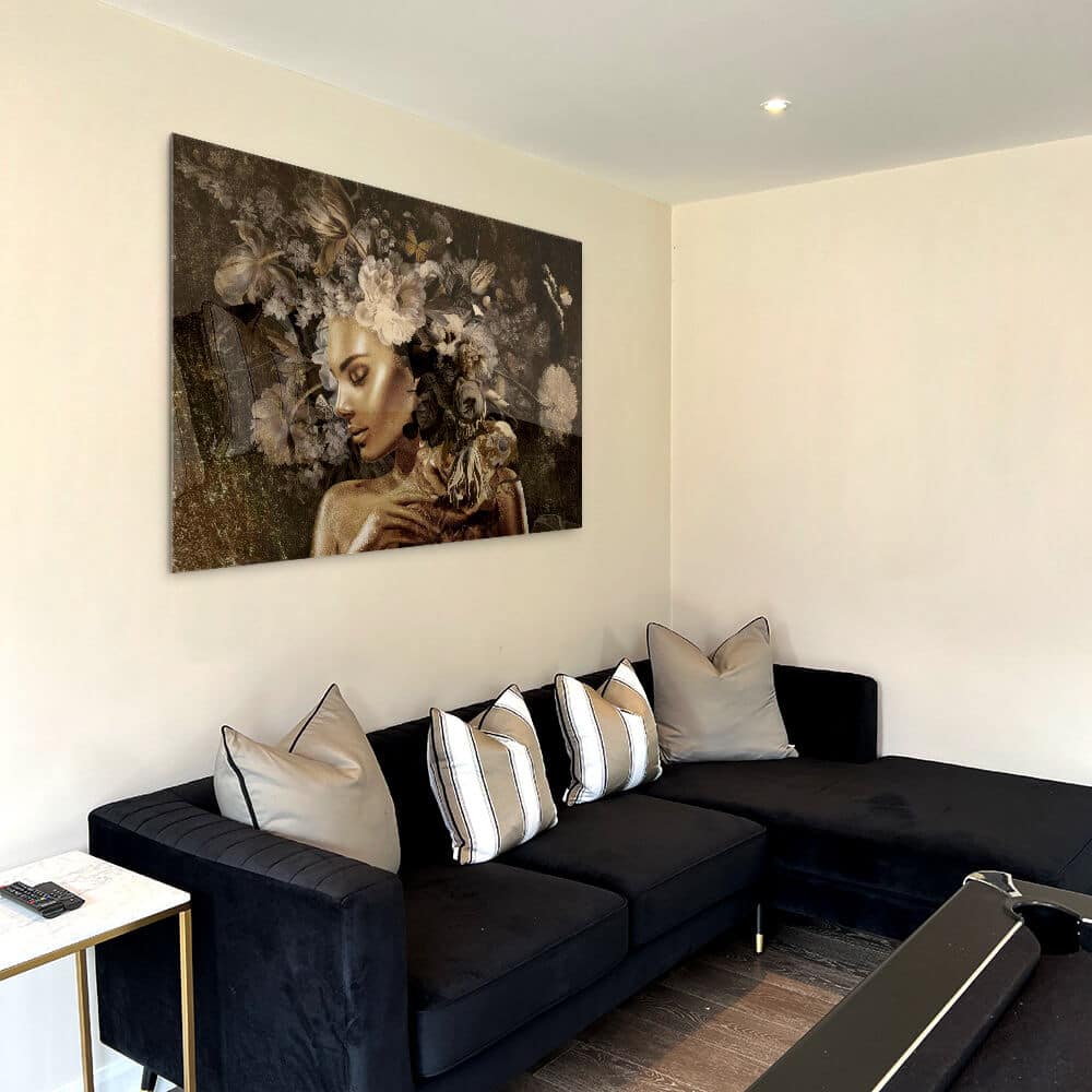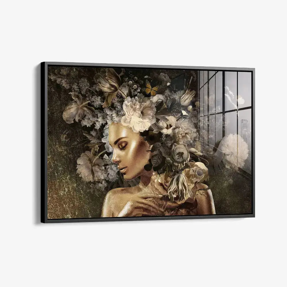 The golden tones of “Auric Reverie” exude luxury and mystique. Delicate flowers and the feminine face create a dreamlike scene.... Read more
