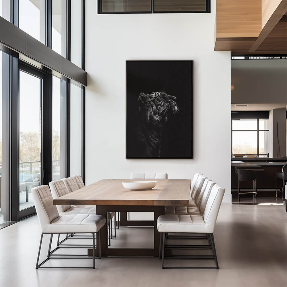 “Stripes of Authority” captures the powerful presence of a tiger in black and white. The detailed textures emphasize its majestic... Read more